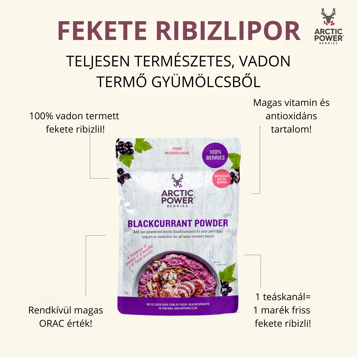 Artic Power Berries Fekete Ribizli por. A fekete ribizli rendelkezik az egyik legmagasabb ORAC -értékkel, ami a kiemelkedően magas antioxidáns tartalmának köszönhető. A magas tisztaságú fekete ribizli ízletes és tápanyagokban gazdag. A praktikus kiszerelésnek és formulának köszönhetően könnyen beilleszthető a mindennapi rutin részeként életünkbe. Hozzáadott cukrot, tartósítószert vagy adalékanyagot nem tartalmaz.